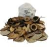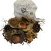 3 folhas de cacau, 15 folhas de magnólia, 10 folhas de jaca, 2 cocos de mintola , 1 vagem de amendoim, 3 canoinhas, 1 casca de coco natural, 1 sapucaia XL, 1 castanha do Pará, 2 coco orinocensis, 1 casca de esterculia, 1 vagem de palmeira XXL